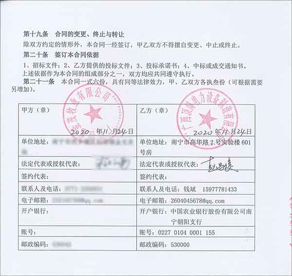熱烈祝賀廣西頂博電力設備制造有限公司與廣西桂墾金茂牧業(yè)有限公司于2020年11月24日成功簽訂7臺
